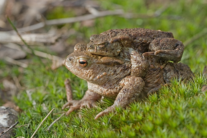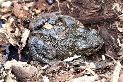 Left, Common Toad Bufo bufo mated pair © Allan Parker ARPS and right, adult hibernating © Derek Bateson.
