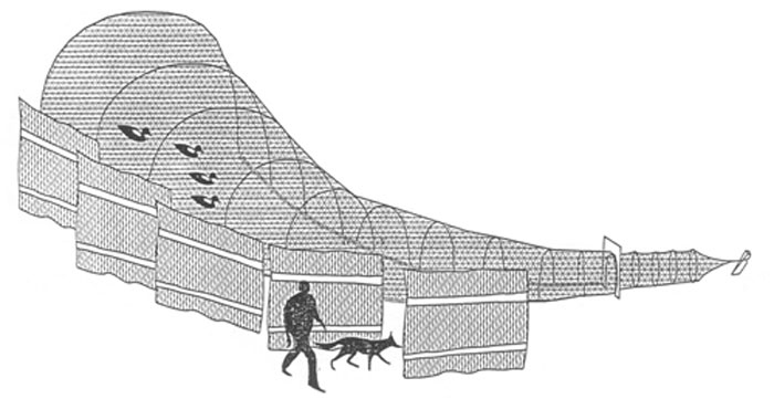 Information about a similar decoy at Slimbridge in Gloucestershire (Wildfowl & Wetlands Trust), where one still exists, provides a clearer description. In this case, six channels led from the lake, each channel covered by a net starting about 2.7 m (9 ft.) wide and gradually narrowed forming a funnel about 12 m (40 ft.) long curving in a sort of “L” shape. The ducks were enticed along the pipe by exploiting their natural reaction to a predator. If ducks on a pond spot a fox prowling on the bank, rather than fleeing from it, surprisingly, they swim towards it, maintaining a safe distance but keeping the fox in sight similar to the way birds will “mob” a predatory cat in your garden. The decoyman used a dog to achieve the same response. The decoy pipe had a series of reed screens which prevented the decoyman from being seen by the ducks, but the dog popped out between the screens one after the other leading the ducks further up the pipe where they were caught as described above.