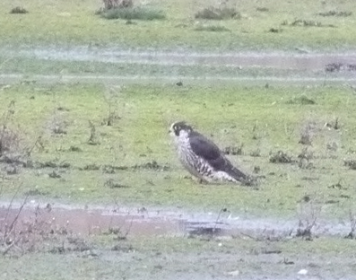A Peregrine was around for 15 minutes and settled on one of the Huxter Well Marsh islands, see image (Pete Greaves).