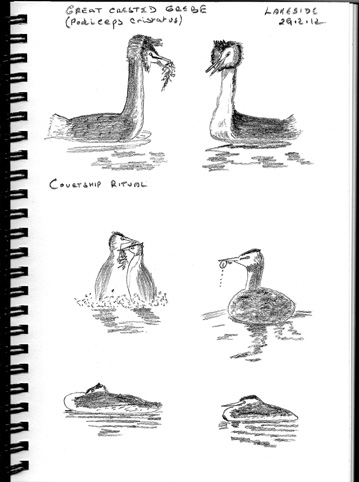 David Horncastle, a regular birdwatcher at Potteric Carr was out with his sketchbook at Lakeside this morning, where a pair of weed-dancing Great Crested Grebes were drawn by him (below). David comments: "The Great Crested Grebes went through their ritual in the water in front of the flats. The male caught a sizable fish but crash dived when a Black-headed Gull landed alongside with nefarious intent. The Grebe surfaced without the fish."