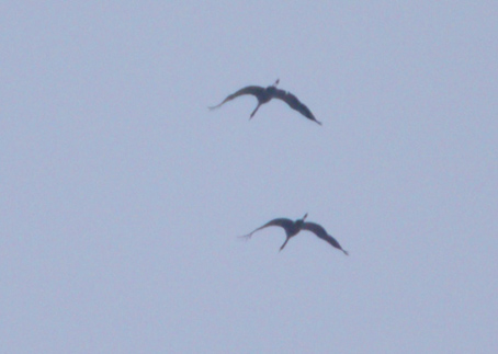 The pair of Common Cranes over Potteric Carr today, 18th March 2012 © Robin Mokryj