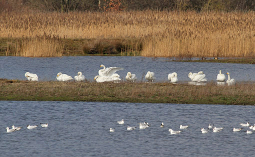15 Whooper Swans (all adults) dropped onto Cell 1b Huxter Well Marsh at 8.35am this morning, see image (Tony Elliott, Brian Buckle, Mick Bird). They were photographed by Tony and later by Pete.