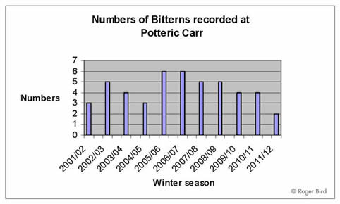 Figures in the bar chart above are taken from PCNR published bird reports, scientific papers, and the Reserve’s annual Bittern censuses. They are not estimates, but specific numbers of birds present in the winter season October–March, from 2001 onwards. The 2011–12 figure is provisional, however, only covering October 2011 to January 2012. Unless more than two individuals are proved before the end of March this year, the bar chart demonstrates that 2011–12 has been the worst winter for Bitterns at Potteric Carr in the past ten years.