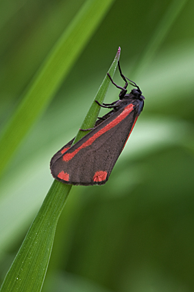 Left, Narrow-boarded 5-spot Burnet Moth Zygaena trifolii and right, 6-spot Burnet Moth Zygaena filipendulae both images © Allan Parker ARPS