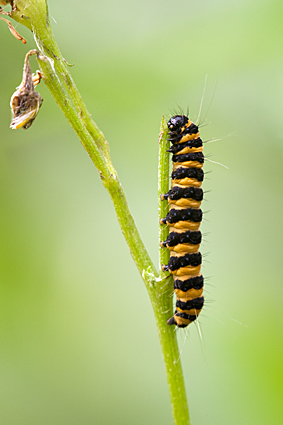 Cinnabar Moth Tyria jacobaeae left adult moth and right caterpillar © Allan Parker ARPS.